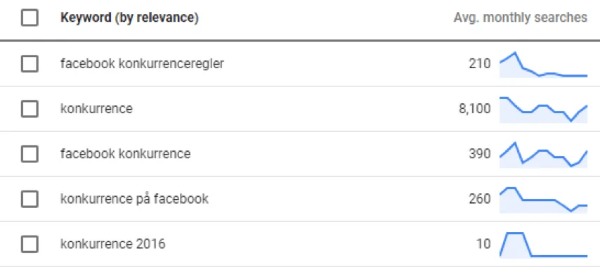 Her kan vi se, at der er 210 månedlige søgninger på ordet: ”facebook konkurrenceregler” og henholdsvis 390 søgninger på ”facebook konkurrence” og 260 søgninger på ”konkurrence på Facebook”.