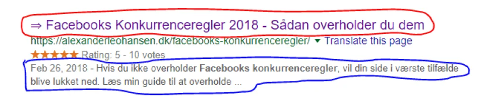 Ovenstående er det, du bliver præsenteret for ude i Googles søgeresultater, når du f.eks. søger på ”Facebook konkurrenceregler”. Derfor er det super vigtigt, at din titel og beskrivelse er tillokkende, så folk klikker på dit resultat og ikke konkurrententen.