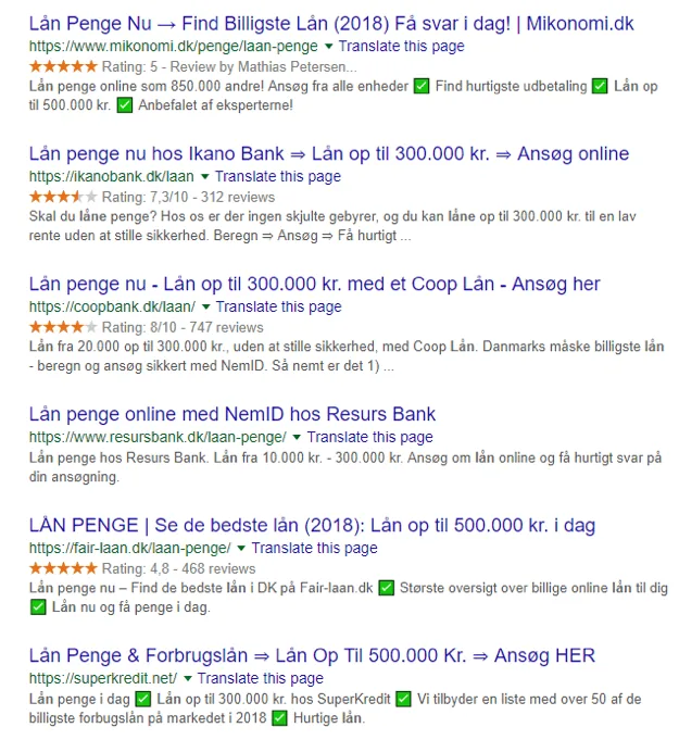 Dog er det ikke alle emner, hvor det er en fordel at skille sig ud med emojis og tegn. Se eksemplet, når man søger på ”lån”: